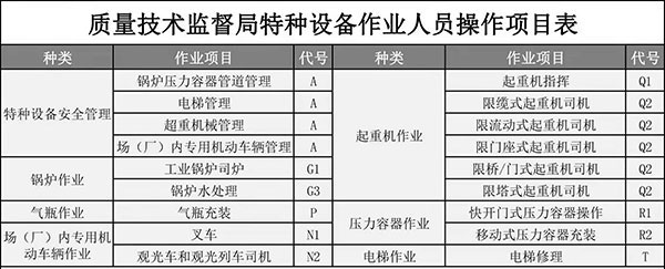 《特種設備作業證工種》(1),特種安全設備管理A ( 2),起重機指揮Q1(3),起重司機(限門座式起重機)Q2(4),起重司機(限橋式起重機)Q2(5),起重司機(限門式起重機)Q2(6),起重司機(限纜索式起重機)Q2(7),起重司機(限塔式起重機)Q2(8),起重司機(限流動式起重機)Q2(9),起重司機(限升降機)Q2(10),叉車司機N1(11),觀光和觀光列出司機N2(12),電梯維修T(13),鍋爐壓力容器壓力管道管理A (14),電梯管理A(15),起重機械管理A(17),場(廠)內專用機動車輛管理A(18),工業鍋爐司爐G1(19),電站鍋爐司爐G2(20),鍋爐水處理G3(21),快開門式壓力容器操作R1(22),移動式壓力容器充裝R2(23),氣瓶充裝P(24),金屬焊接操作(壓力焊PE焊)(25),非金屬焊接操作(壓力容器焊)