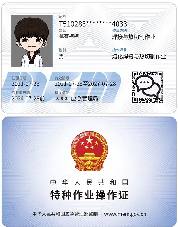 1、焊工特種作業操作證,俗稱焊工上崗證,由安全生產監督管理局即(原安監局)現應急管理局頒發,是一種類似于身份證的IC卡證件,全稱是熔化焊接與熱切割作業,這個證書主要證明你具有此工種安全操作的知識和能力,是6年有效期,每3年一審,復審時間前2-3個月申請復審即可。