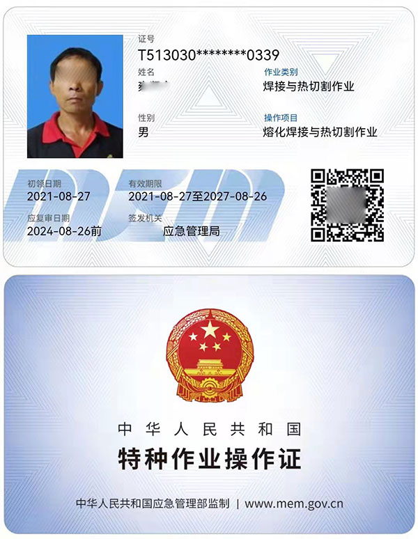 1、焊工特種作業操作證,俗稱焊工上崗證,由安全生產監督管理局即(原安監局)現應急管理局頒發,是一種類似于身份證的IC卡證件,全稱是熔化焊接與熱切割作業,這個證書主要證明你具有此工種安全操作的知識和能力,是6年有效期,每3年一審,復審時間前2-3個月申請復審即可。
